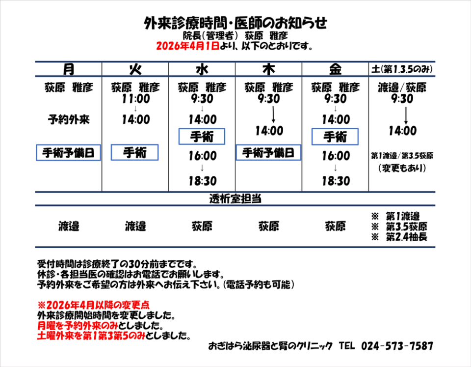 お知らせ ホーム > お知らせ > 外来診療時間変更のお知らせ 外来診療時間変更のお知らせ 2026/02/27 4月より外来診療時間を変更させていただきます。 どうぞよろしくお願いいたします。 最近の投稿 外来診療時間変更のお知らせ 休診のお知らせ 外来診療時間変更のお知らせ 2月診療担当変更のお知らせ お知らせ 月別投稿一覧 月を選択 2026年2月 (3) 2026年1月 (2) 2025年12月 (1) 2025年9月 (1) 2025年8月 (1) 2025年6月 (3) 2025年4月 (2) 2025年3月 (1) 2025年1月 (4) 2024年12月 (1) 2024年11月 (1) 2024年10月 (4) 2024年8月 (1) 2024年6月 (2) 2024年3月 (1) 2024年1月 (1) 2023年11月 (1) 2023年10月 (1) 2023年9月 (1) 2023年8月 (2) 2023年4月 (1) 2023年3月 (2) 2023年2月 (2) 2022年12月 (1) 2022年10月 (7) 2022年9月 (3) 2022年8月 (1) 2022年6月 (3) 2022年5月 (4) 2022年4月 (3) 2022年3月 (3) 2022年2月 (3) 2022年1月 (1) 2021年12月 (4) 2021年11月 (1) 2021年10月 (2) 2021年9月 (3) 2021年8月 (1) 2021年7月 (1)
