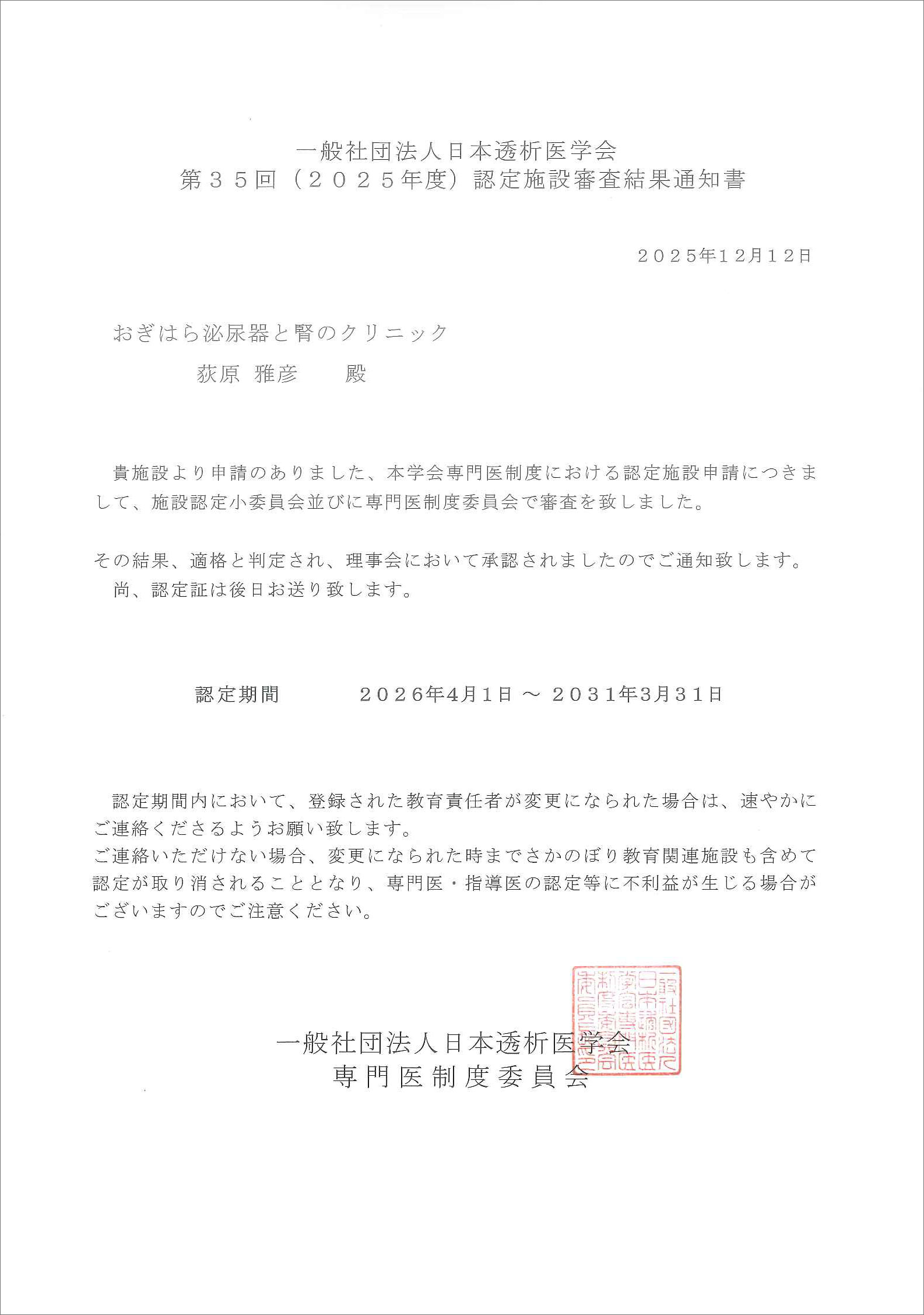 トピックス ホーム > トピックス > 一般社団法人日本透析医学会認定施設として承認されました! 一般社団法人日本透析医学会認定施設として承認されました! 2025/12/19 当院は日本透析医学会教育関連施設より認定施設への移行が承認されました。 県内では2番目の認定施設医療機関となります。 最近の投稿 一般社団法人日本透析医学会認定施設として承認されました! CVP・WAVE・スペーサー・PUL(ウロリフト)等手術件数 先進技術が搭載されたデジタルX線TVシステム「Astorex i9」を導入しました! CVP・WAVE・スペーサー・PUL(ウロリフト)等手術件数 予約時間について 月別投稿一覧 月を選択 2025年12月 (1) 2025年11月 (2) 2025年10月 (3) 2025年8月 (1) 2025年7月 (1) 2025年6月 (2) 2025年5月 (2) 2025年1月 (2) 2024年12月 (3) 2024年10月 (2) 2024年9月 (2) 2024年8月 (3) 2024年7月 (3) 2024年5月 (1) 2024年4月 (1) 2024年2月 (1) 2023年2月 (1) 2022年10月 (1) 2022年6月 (1) 2022年4月 (1) 2021年12月 (1)
